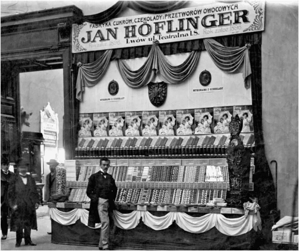 Свою продукцію на виставці представив й відомий промисловець Гефлінґер. Виставковий стенд підприємця був прикрашений м’якими тканинами, драпірування яких нагадувало форму фестонів та утворювало членовані складки. Увагу відвідувачів привертали  правильно сформовані солодкі ряди з виробів: чітко за ритмічною композицією викладені в горизонтальній площині плитки шоколаду різного наповнення та кольору обгортки, вертикальну основу формує солодка мозаїка з тістечок, цукерок та печива (прямокутні, подовгасті та круглі). У середній частині під вивіскою були  розміщені шоколадні портрети та послідовність однакових рекламних плакатів із зображенням молодих панянок.
